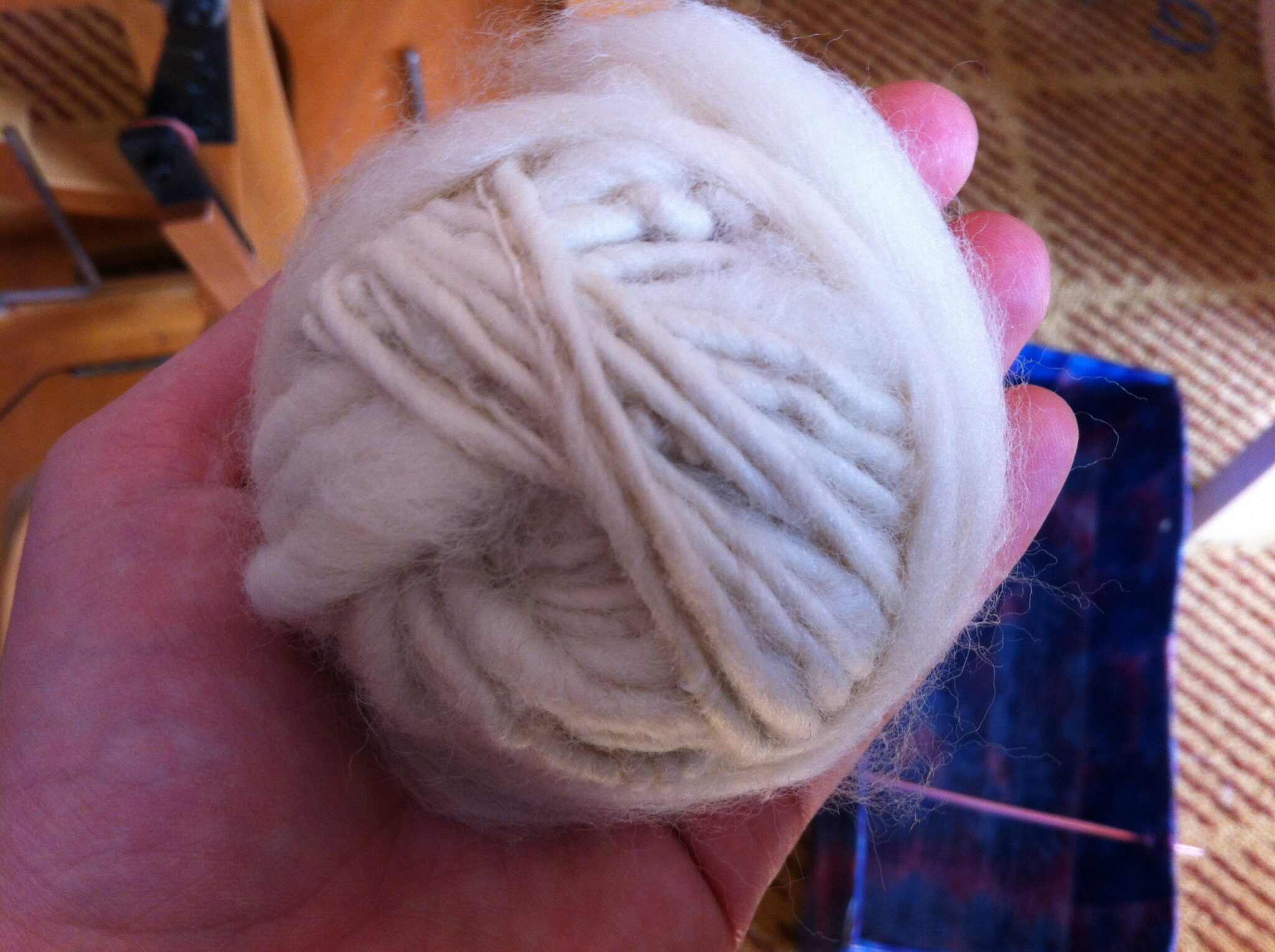 Tuesday and Thursday of this past week, after carding some batts, Cyndi let me practice spinning on her smaller Ashford wheel (aka her “baby”) .  I have produced three small balls of ‘yarn’ that look like this: