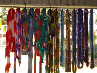 What a day! Beautiful sunshine and a back porch with a view of handspun yarn and hand painted roving.