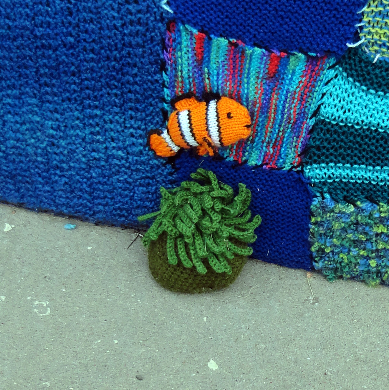The entire front of building and the fountain was yarn bombed (covered in yarn) along with the trees. What an amazing thing to see!!! The amount of detail is beyond comprehension. Photos really can not capture the beauty or scale of the installation. The work that went into this, along with the hours upon hours of knitting and crocheting is so admirable. I am seriously in awe. You have to see it in person!