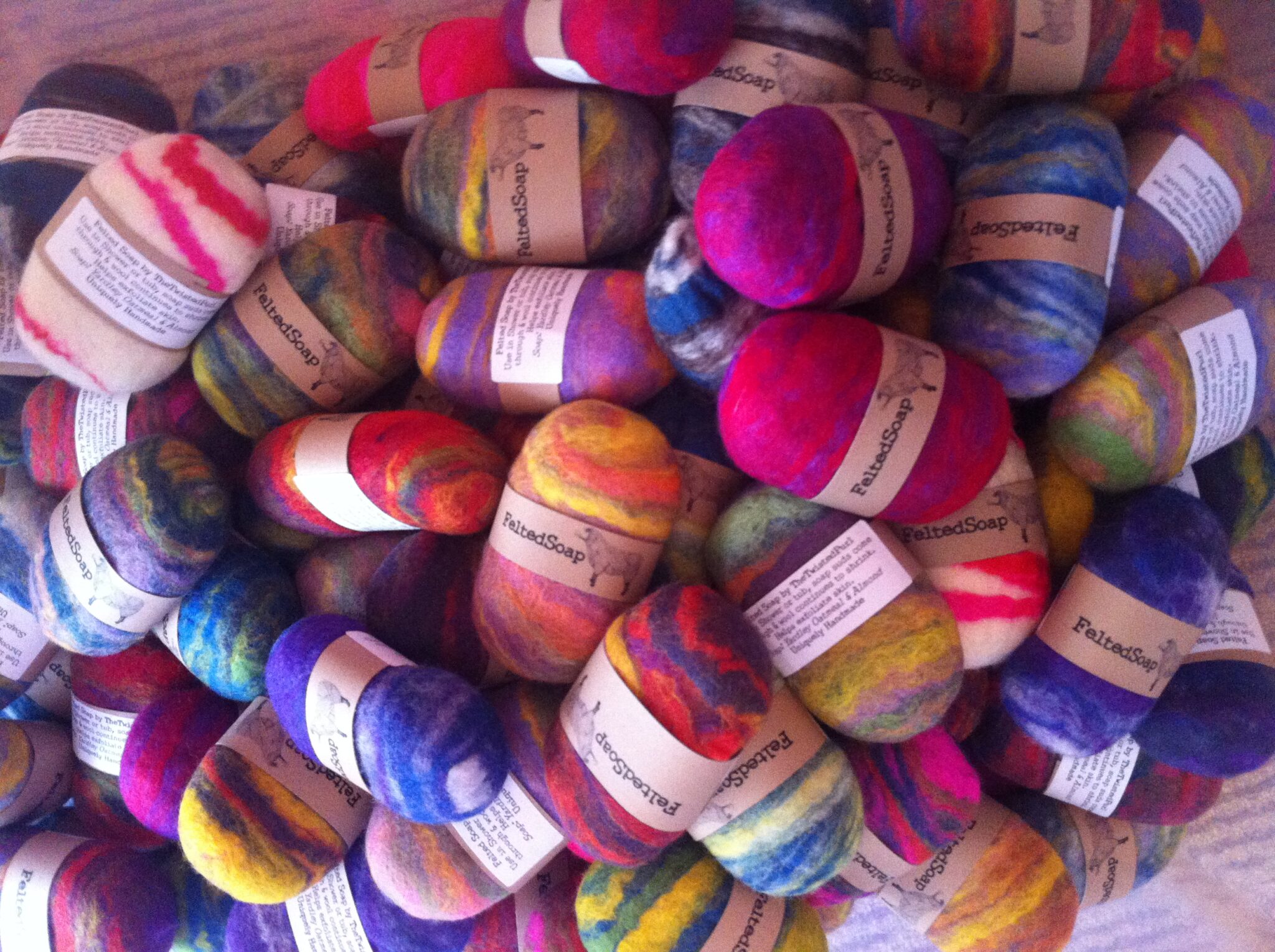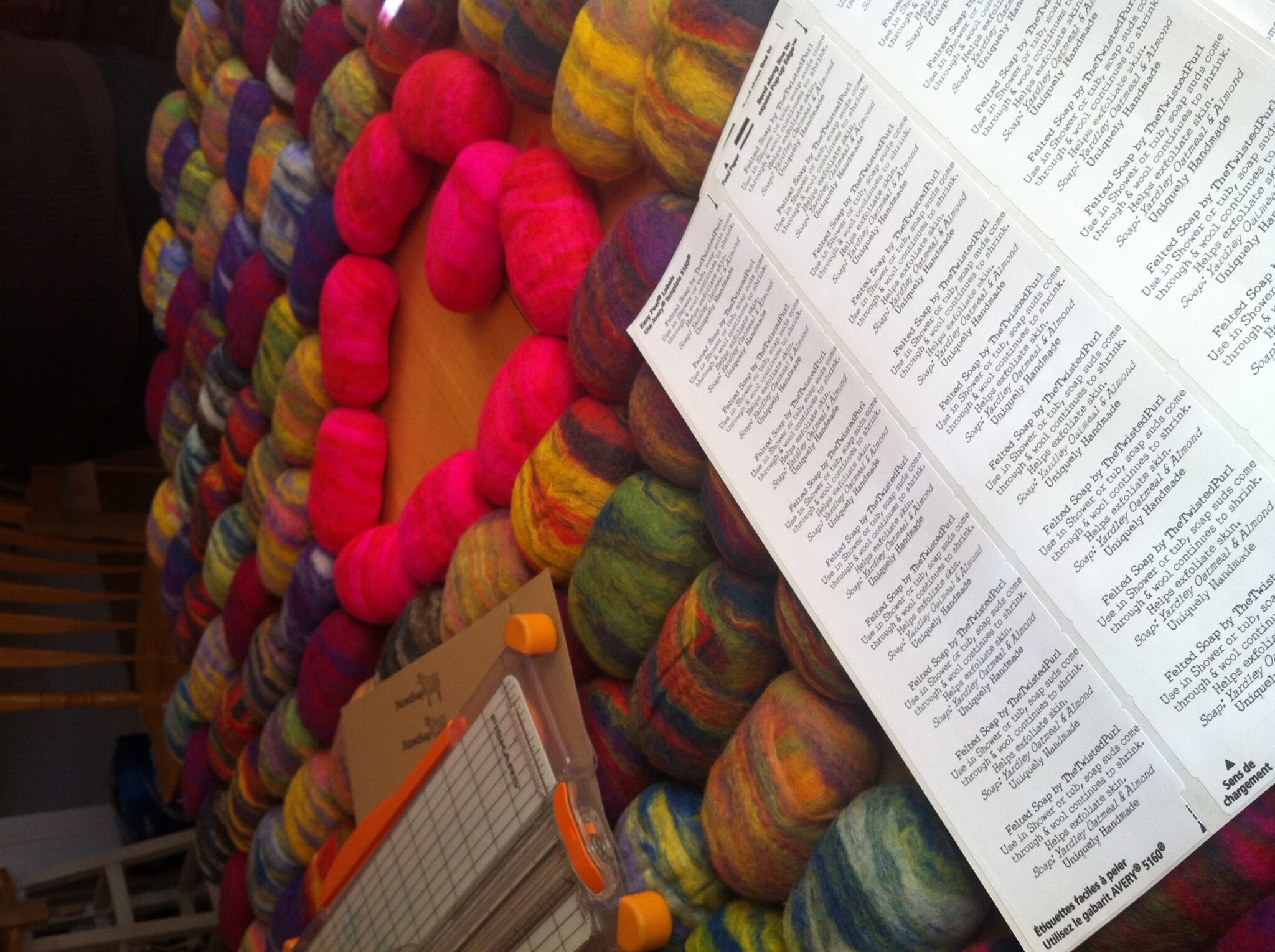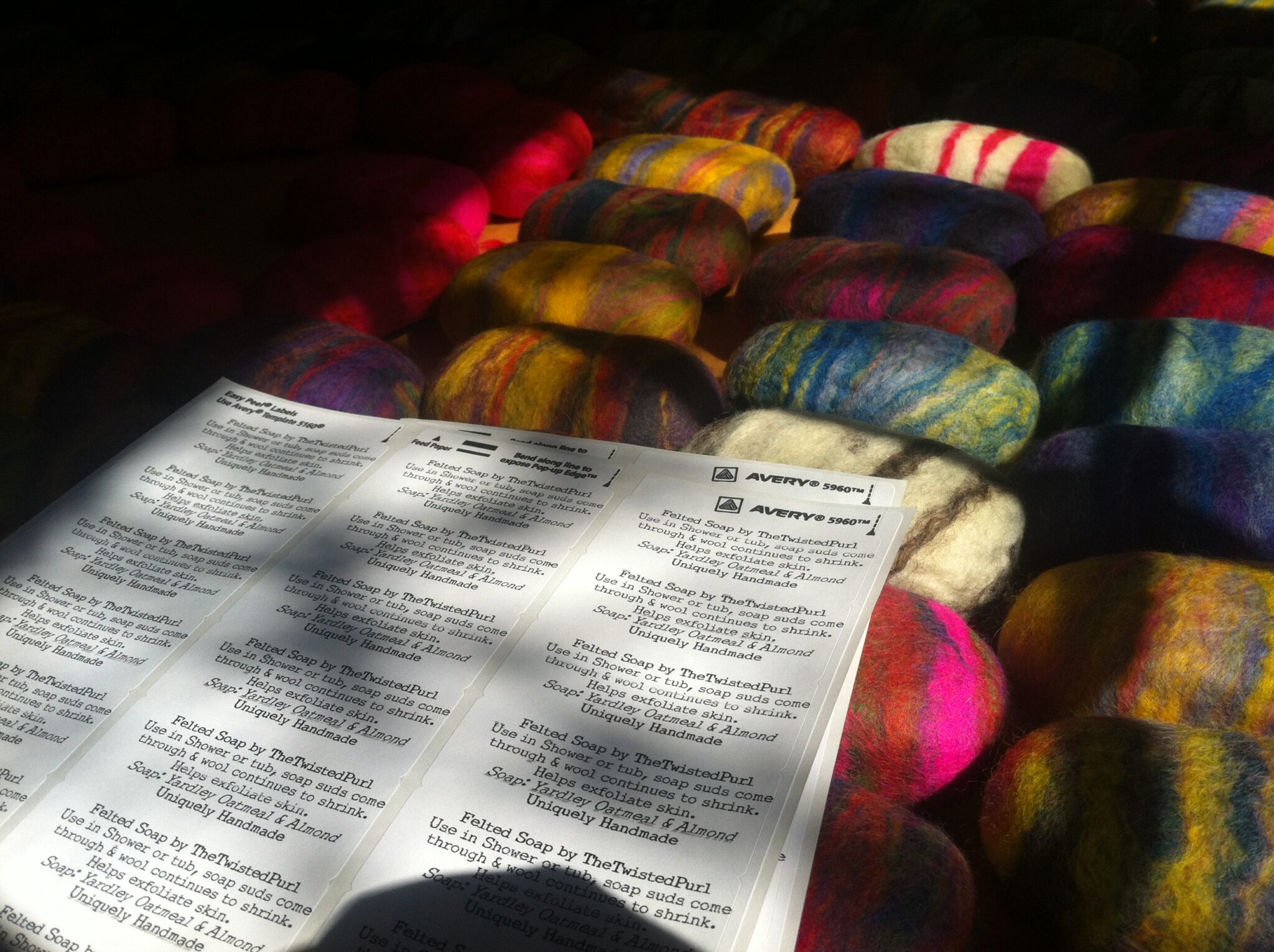 Hey Guys! My week at The Twisted Purl was pretty short due to some more bad weather around these parts. It is supposed to warm up next week. I’m just hoping it will finally turn into Spring like it has in the studio. I went back to my roots at The Twisted Purl by helping with the labeling and packaging of Spring time soaps. All of the colors are so happy, and most of the soaps that was labeled are already on their way to stores around the world. Here are some photos of all of the soaps on the table. Cyndi had arranged some of them into this cute heart shape before I even arrived.