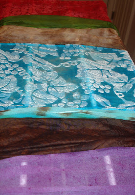 The velour and silk was a very interesting fabric to play with. Above you see it in blue (which I adore!) below it is in chocolate. With the blue, brown, and red today we did sets so I will have them with small key chain/cardholder bags, and a bit larger makeup size bag. All with the silk velour. It is quite stunning to see the way the light hits them.