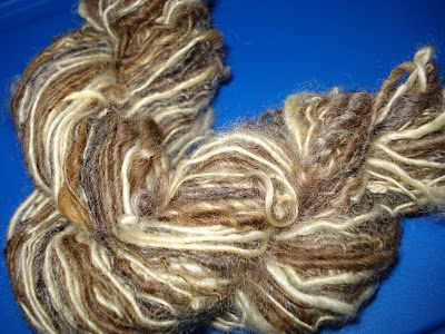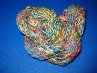Lastly, is pure barnyarn handspun. This is a blend of four different wools I recently received. Instead of carding them, I spun them straight in their natural glory. I left some of the curly locks hanging out in the open and did not even ply it. Gotta love it!