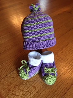 Our very own Kay Meadors (NaturalStateKnits on Ravelry) created the most adorable baby hat and sneakers. Check out the pattern on Ravelry.