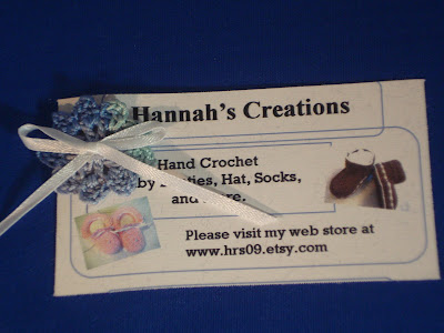 Everyday the items are coming in for the Toad Suck Sacks. My mailbox is such a joy. I have got some really cool business cards from Diamondmeenuh Creaions, BowsByMom, TSmithDesigns, a cool postcard size card from NightSkyProducts, a bookmark from Glassbead, cute handmade notebooks by dogwoodlane, and a very adorable hand crocheted bow on a hair clip from Hannah’s Creations (hrs09).