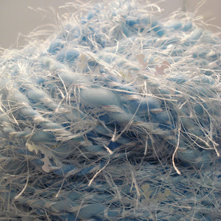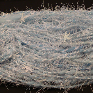 I threaded 85 sequined snowflakes. Then I spun some blue yarn. Next I thought it needed a little blizzard effect so I added in the white eyelash yarn.