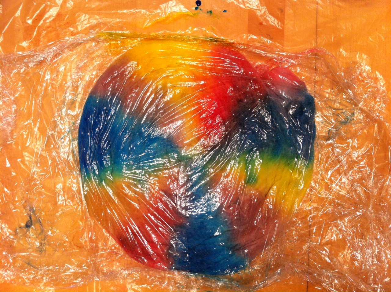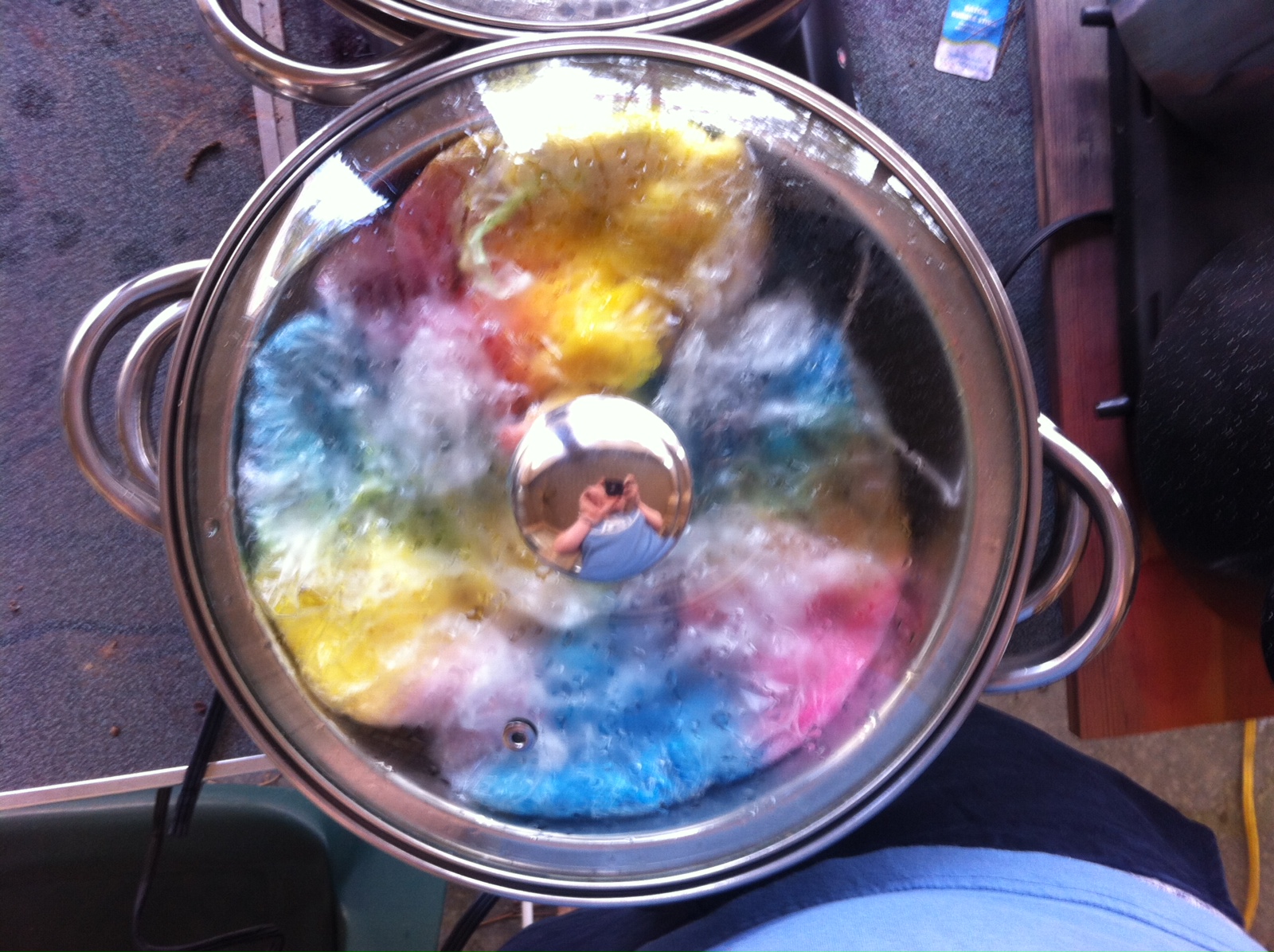 On Thursday, Cyndi taught me a few methods for dyeing and painting wool roving. As usual, I was hesitant about choosing my colors, and unconfident in my final product. I am, however, excited to see how they look as carded batts and/or spun yarn! Cyndi said that if she has time, she might spin one of them this weekend (ahh!). Although I’m a little worried, I’m not too worried, because if it’s really ugly we can just sell it to my mom. I don’ have a picture of the first roving I dyed (which was very “Springy”), but the second is pictured below in the shape of a pizza.