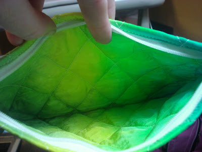 After the ladies took me to the new yummy restaurant, Gusano’s. I came home and set the yarn. I really loved the colors once they were all set. I figured I had some left over dye still blended up, so I did a few experiments. I just recently got more silk fabrics to play with. Scarves, sarongs, makeup bags, and some with crushed velvet. Here is one of the quilted makeup bags: