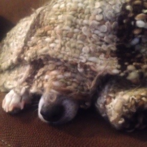 Daisy Covered with BlanketOur sweet dog, Daisy, is great at covering up and hiding. She actually pulls the folded blankets up off the back of the couch and wraps herself up in them!  Sometimes she even pulls multiple blankets and makes a comfy looking blanket fort for herself.  But, put a handmade sweater on her she looks like she has been given a death sentence.  Go figure!