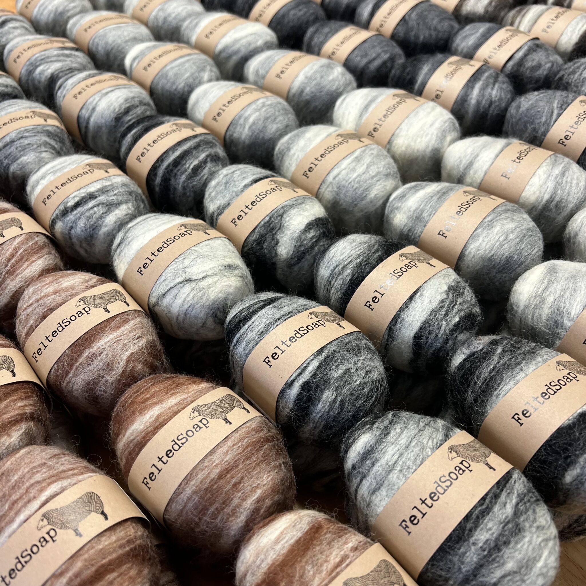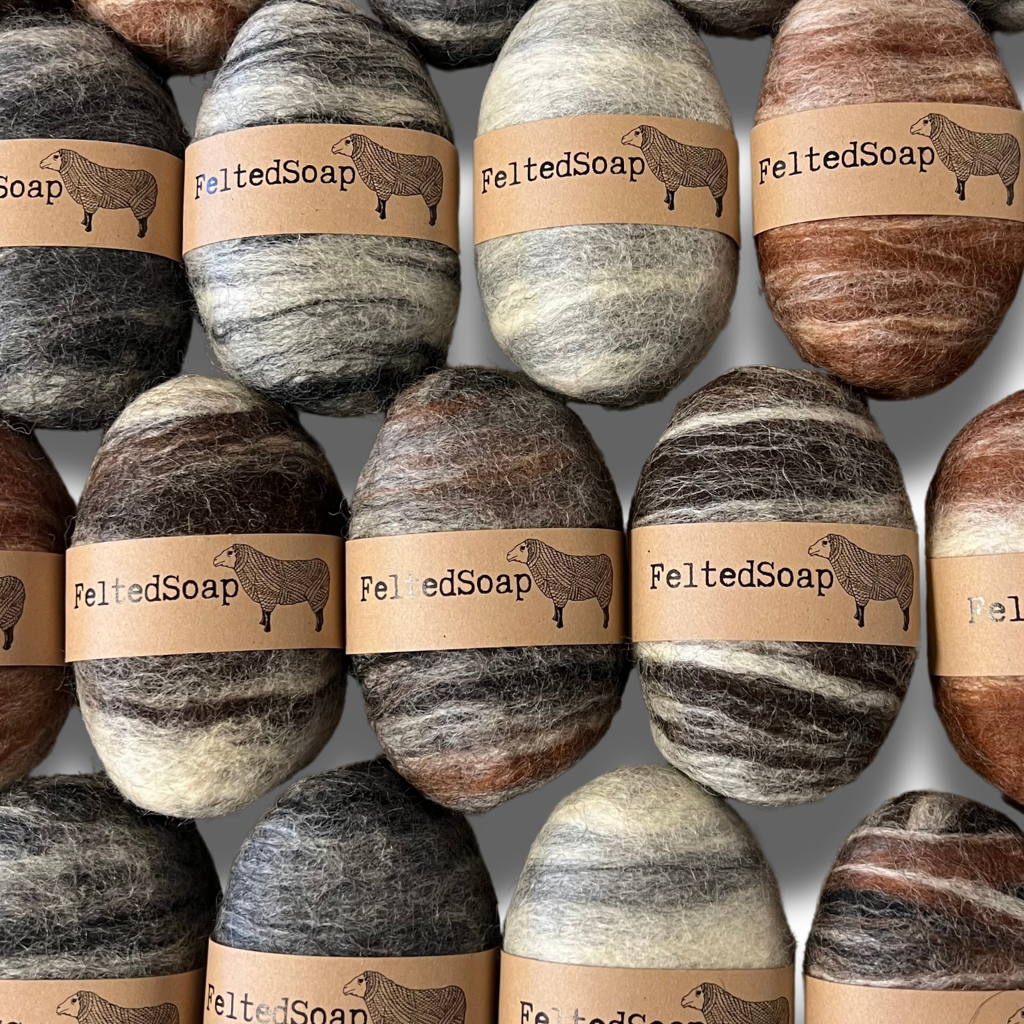 Felted Soap is an exquisite gift for yourself and makes an excellent gift. There’s no need for a washcloth or a loofah, as the outside is wrapped in several layers of professionally dyed wool. Your new Felted Soap gently exfoliates your skin. Soap cleanses skin as it comes through wool. The outer wool stays attached to the soap, continuing to shrink until the soap is gone. You’re left with a little wool scrubby, perfect for use during cleaning. Wool helps prolong life. We recommend letting the soap dry in between uses.