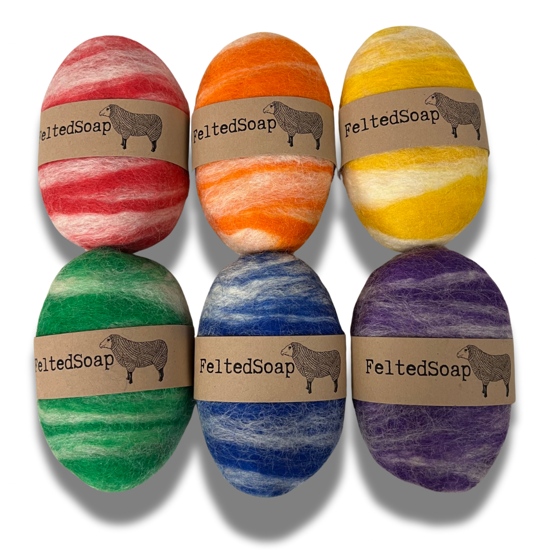 Felted Soap Single Blend 6 pack contains 6 bars of soap, one of each color: Red, Orange, Yellow, Green, Blue, and Purple. Each solid color is blended with white making a single blend colorway.