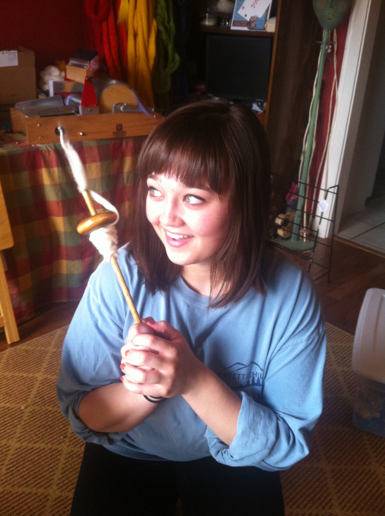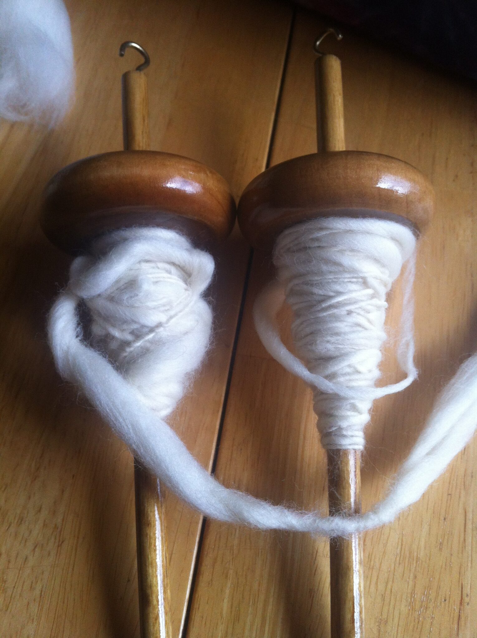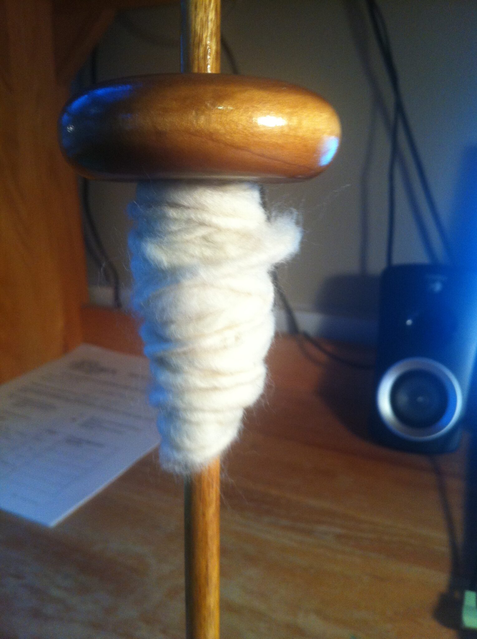 I’m practicing intermittently as I type this post. I’m getting a little bit better. I am mostly actually spinning the fibers now, instead of just wrapping them around the drop spindle. Next week, if I am good enough at the drop spindle, I’ll get to try my hand at the spinning wheel. I’m going to look like such a pro just sitting there, I’m so sure. 🙂 Here is the stage I’m to in my house.