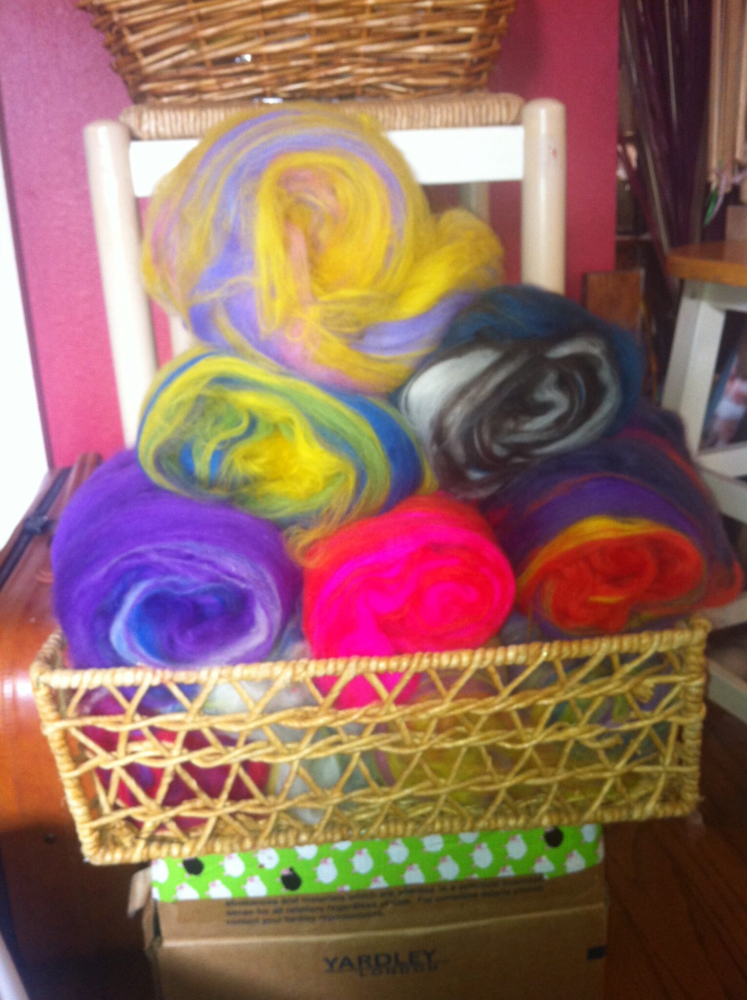 This week at the Twisted Purl studio was really fun. I started my spinning journey with my head held somewhat high, even though I knew that I was going to be in for a good struggle. When I arrived at the studio, I helped Cyndi make some carded batts to be turned into Spring time felted soaps. I always struggle with her requests for these kinds of colors, because I tend to be attracted to greens, dark blues, deep purples, browns, and blacks. Here are the carded batts that I ended up making. (Excluding the pink one, that one is waaaaay too bright to have been made by me 🙂 ) Pay close attention to the one on the top of the stack, which I worked extra hard on keeping happy and seasonal.
